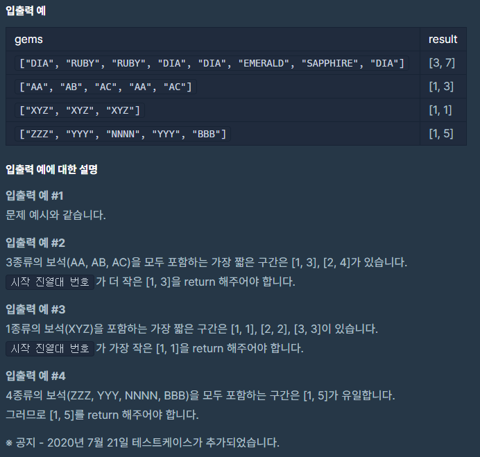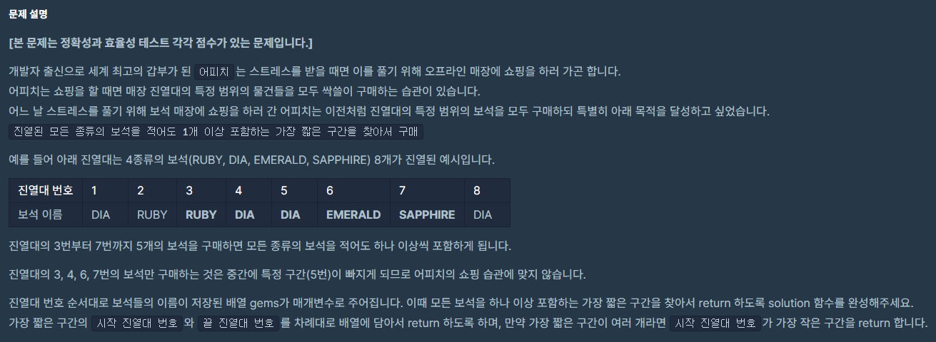 문제 URL : 코딩테스트 연습 - 보석 쇼핑 | 프로그래머스 (programmers.co.kr)