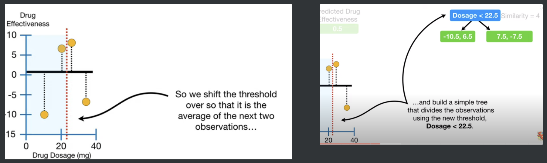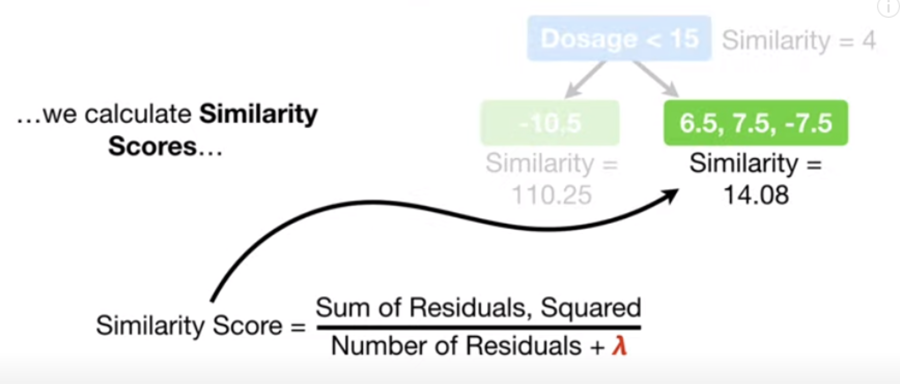 SS(Similarity Score) 계산이 끝나면 이제 이 리프를 분기시켜서 트리를 만들어본다. 4개의 데이터 사이에 분기점을 만들면 총 3개를 만들 수 있고, 이렇게 분기되는 때마다 SS를 계산하여, Gain을 계산한다. 각 트리를 만들때마다 왼쪽, 오른쪽 리프의 SS계산을 하여 기록하면 이제 분기 전후에 대한 비교가 가능해진다. 분기 전에는 7.5와 -7.5가 서로 상쇄시켜서 ss가 낮았던 반면, 분기 후엔, 왼쪽 오른쪽 리프들 각각 상쇄작용이 약해서 ss점수가 더 크다.