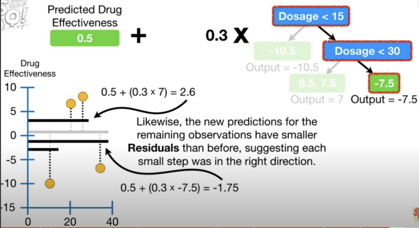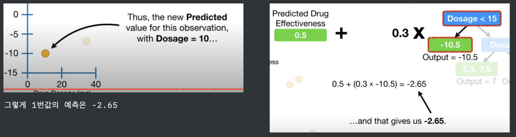2,3,4번의 값들도 각각의 Leaf에 맞는 output Value를 사용하여 새로운 예측을 하였고, 이로써 Initial Prediction보다 좀 더 나아졌다.
