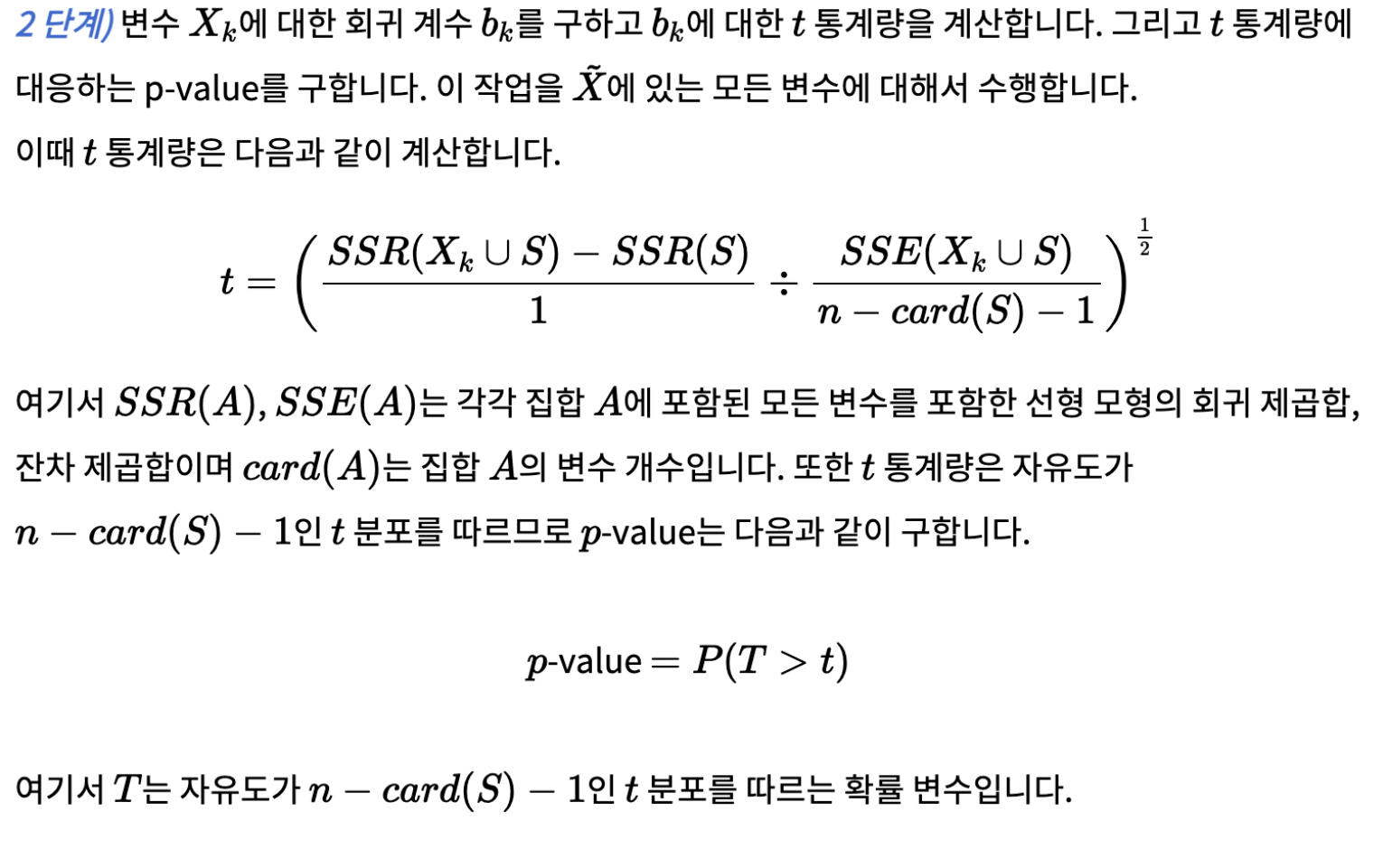 이때 최소 p-value 값과 유의수준을 비교하여 p-value < $\alpha$ 이면 최소 p-value에 해당하는 변수를 S에 포함, 1~2 단계 수행