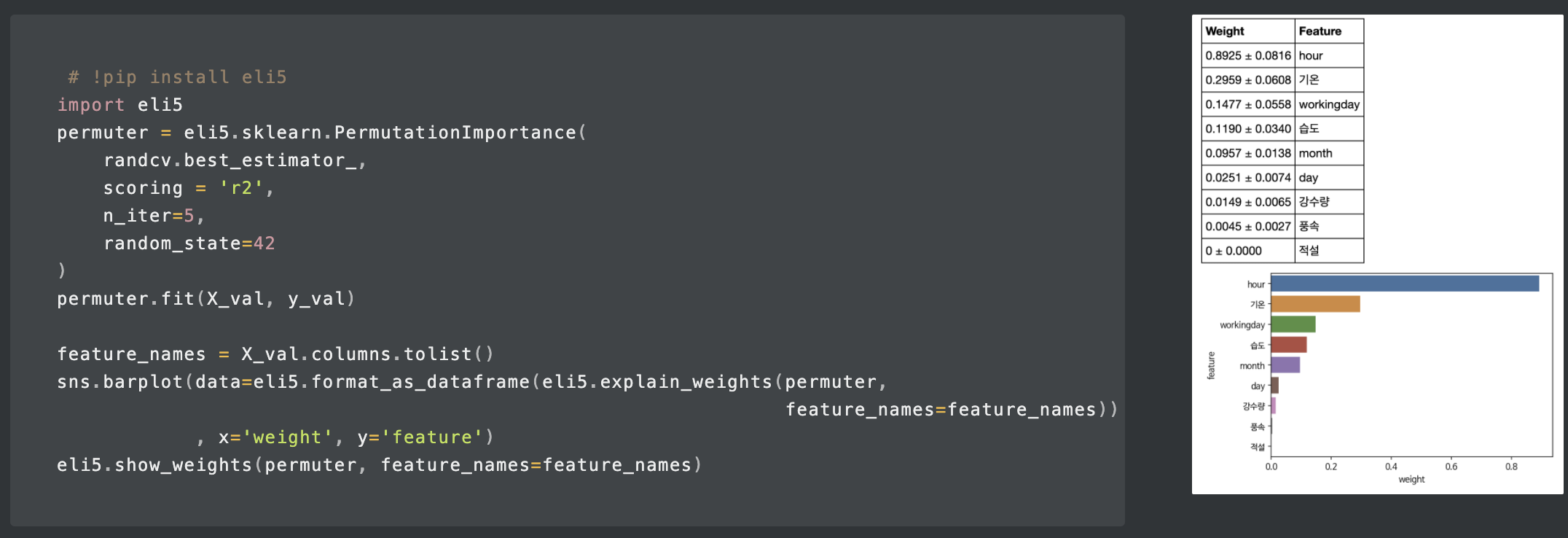 또한, eli5를 통해 Permutation Importance를 볼 수 있고, pdpbox의 pdp_plot, shap으로도 feature_importance를 볼 수 있다.