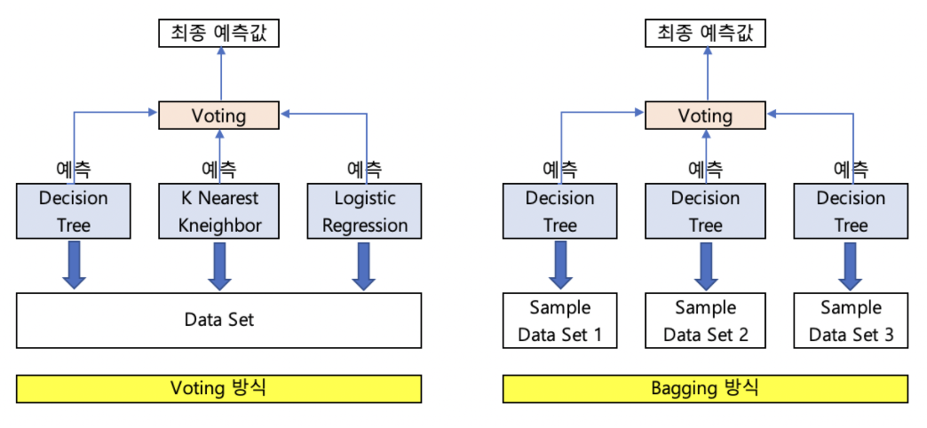 앙상블 기법은 한 종류의 데이터로 여러 학습모델을 만들어, 그 모델들의 예측결과를 다수결이나 펴균을 내어 예측하는 방법을 말한다.