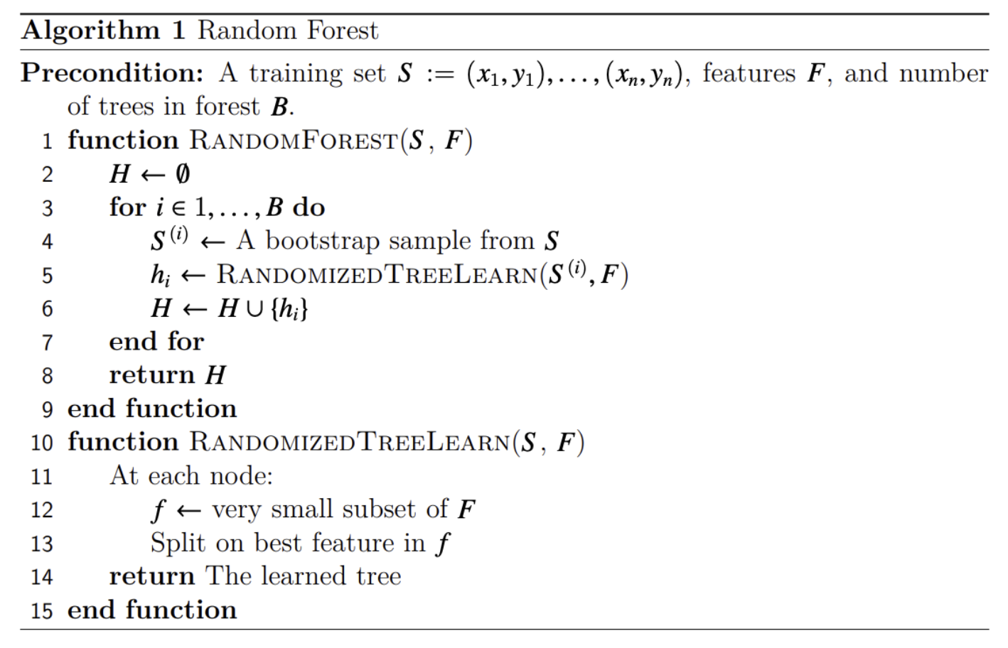 S는 트레이닝셋, Feature 는 F, 랜덤포레스트 안의 트리는 B 라고 한다. H를 초기화하고, 1부터 B까지 (트리들을 순회하면서), $S^(i)$ 에 S로 부터 만든 부트스트랩 샘플을 넣고, $h_i$ 에 트리를 학습시키고(트리의 학습은, 각각의 노드에서 feature의 subset을 최적으로 쪼개면서 학습시킨다. ), 이후, 학습된 트리들 하나하나를 H에 합친 후, 최종 H를 리턴.