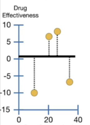 3,4번 사이에 split을 하면, 아래 그림과 같은 분기가 이루어지고, 이 떄의 SS를 계산하면 각각 $SS_{(Dosage<30)} = { {(6.5+7.5-7.5)^2}\over{3+0} } = 14.08 $ , $SS_{left}= {{(6.5+7.5)^2}\over{2+0} }= 98$ , $SS_{right}= { { (-7.5)^2 } \over {2+0} } = 56.25$이고, ${Gain} = { SS_{left} + SS_{right} - SS_{ROOT} } = {98 + 56.25 - 14.08} = 140.17$ 이다.