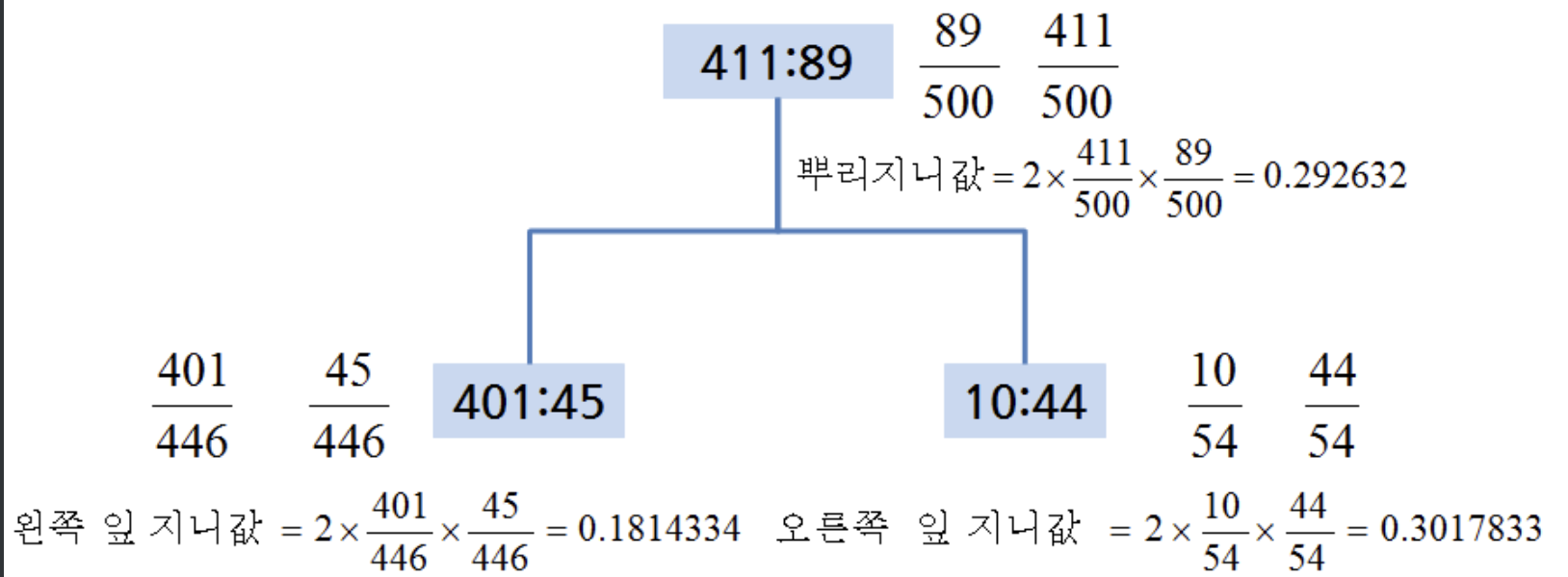 임의의 새로운 변수가 데이터셋으로부터 클래스 라벨의 분포를 따라 무작위로 분류된 경우, 임의 변수의 새로운 인스턴스의 잘못된 분류 가능성에 대한 측정치. 분류가 잘 되었는지 판단할 수 있는 척도이다. $G_i = {1 - \Sigma_{k=1}^n{p_ik^2} }$
