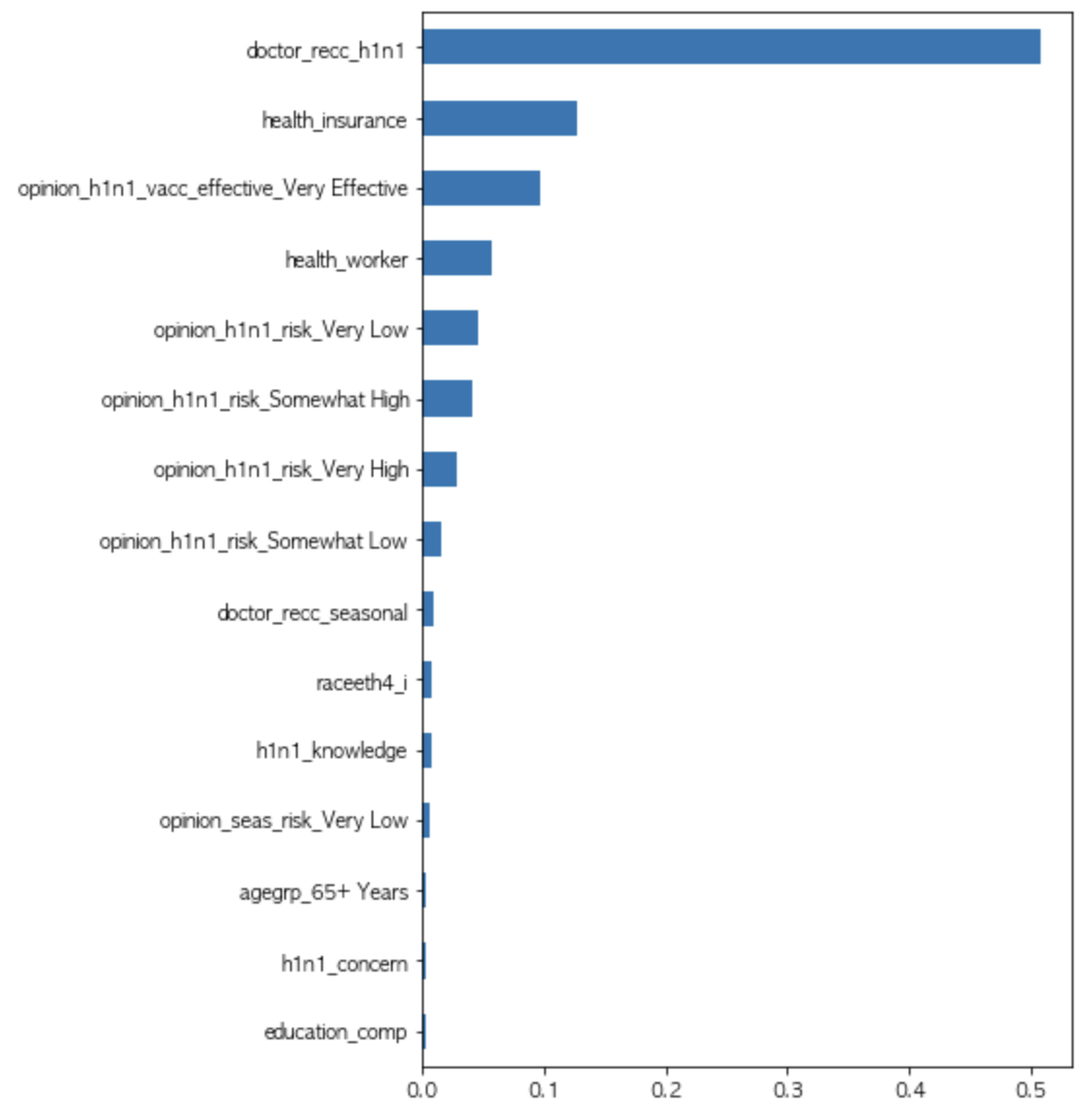 각 columns의 중요도 시각화 doctor_recc_h1n1 의사의 권유가 있었다는 feature가 중요성이 높았고, 그 다음 건강보험 유무였는데, 이 두 변수 사이에 작은 상관관계가 있을것으로 추정됩니다. 그 이유는 보험있는사람들이 병원에 좀더 자유롭게 (가격부담없이) 진료받으러 갔을것이며, 또한 보험이 있기에 백신접종 또한 권유를 더 잘받지않았을까? 또한, 세번째 피쳐가 백신이 효과적이라고 생각하는것 네번째가 의료종사자, 다섯번째는 백신위험이 적다는의견입니다.