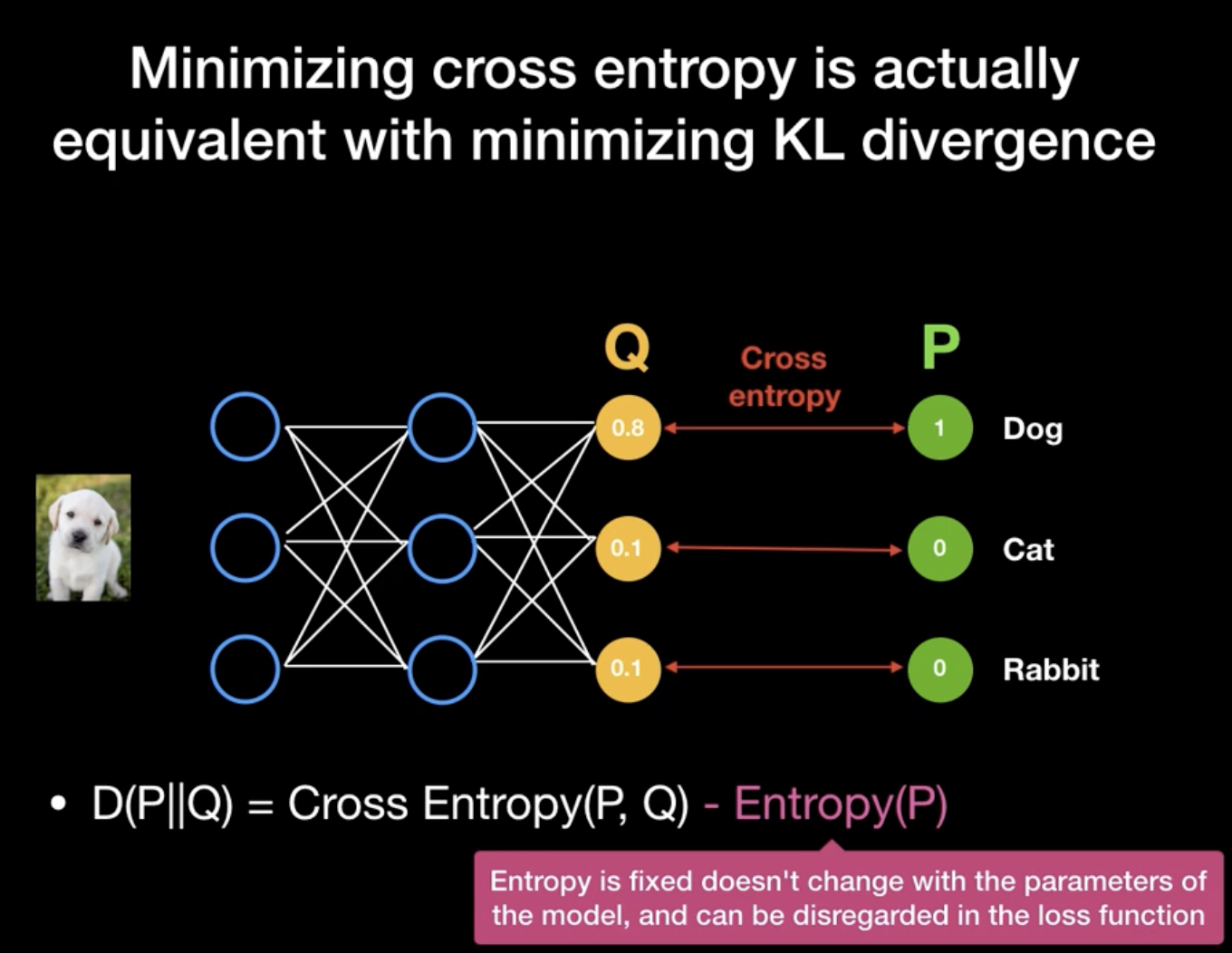 결국 KL-Divergence 를 사용해도, Entropy(P)가 상수이므로 뒷부분이 무시되고, 크로스엔트로피를 쓰는것과 같은 효과를 발휘하는것.