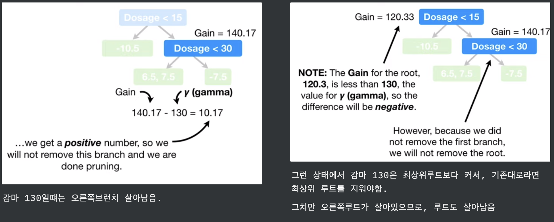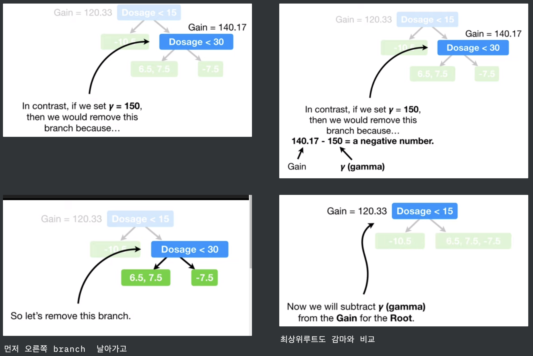이로써, SS Score와 Gain 을 통하여 트리를 만들었다. 이제 트리를 Prune해야한다. Prune에서는 Gamma($\gamma$)를 사용한다. Gain보다 $\gamma$가 크면 가지친것을 삭제하는 것이다.