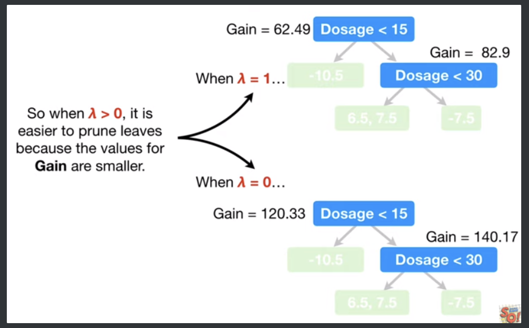λ 값에 따른 Gain의 차이가 위와같다. SS를 계산할 때, λ가 분모에 들어있으므로, λ가 커지면 -> SS가 작아지고, 이에따라 Gain도 작아지는 것이다.