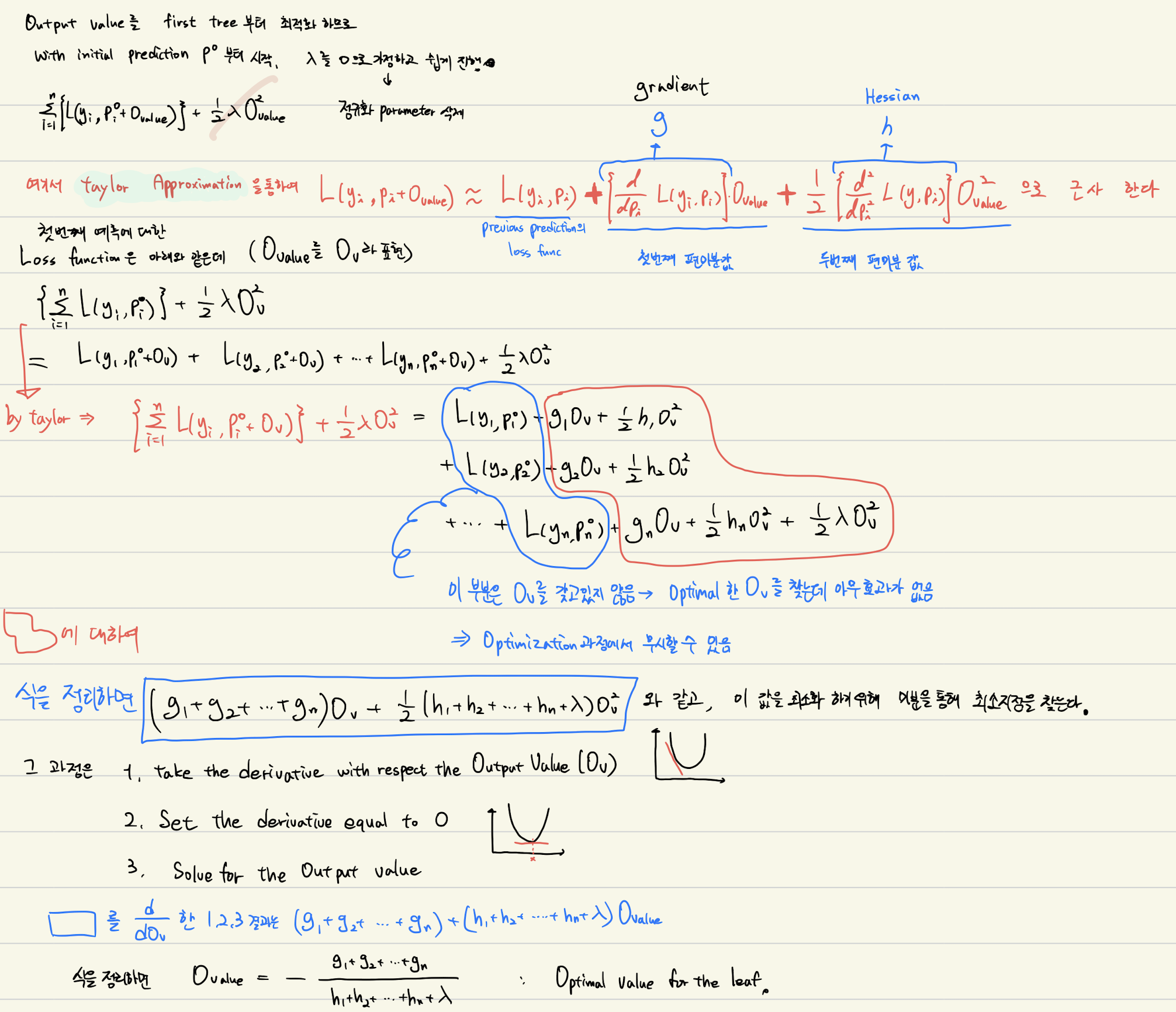 테일러 근사를 통해 Loss Function을 쉽게 근사하고, Gradient와 Gession을 통해 식을 편하게 바꾸고나서 풀고 정리하고 풀고 정리하면, 어떻게 Output Value 식이 만들어졌는지 알 수 있다.!